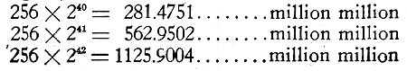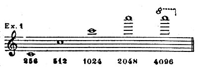 Let us endeavor to trace more intelligently the mathematical relation between color vibrations and tone vibrations. Taking the vibration number of middle C (at International Pitch, 256 a second), and going upward by octaves, we have the numbers:Beyond this we pass the limit of human hearing, but let us suppose, nevertheless, that we can keep on going up octave over octave. By use of logarithms and the kindly co-operation of Professor Edward V. Huntington, of Harvard, we find